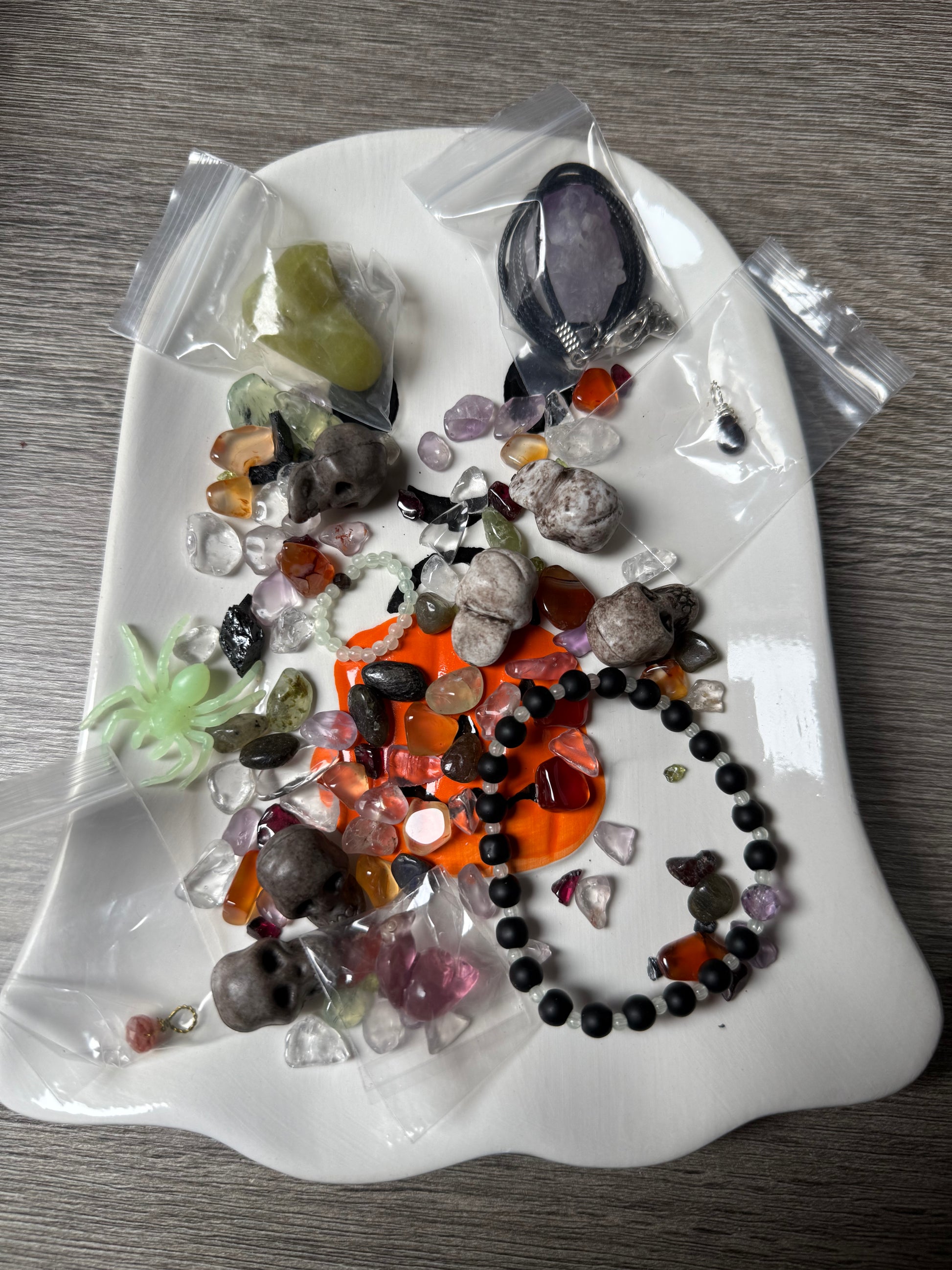Dieses Kristall Konfetti steht ganz für Halloween. Man findet bei allen Edelsteinen die typischen Halloween Farben und nachtleuchtende Sachen sind auch dabei. Es sind Figuren und Schmuck enthalten. Wenn ihr wissen wollt was genau drin ist schaut gerne bei Tiktok oder Instagram das Video wie ich das Konfetti mische. Das zweite Bild zeigt einen Beispielscoop und der Preis bezieht sich auf eine Schaufel vom Halloween Konfetti.