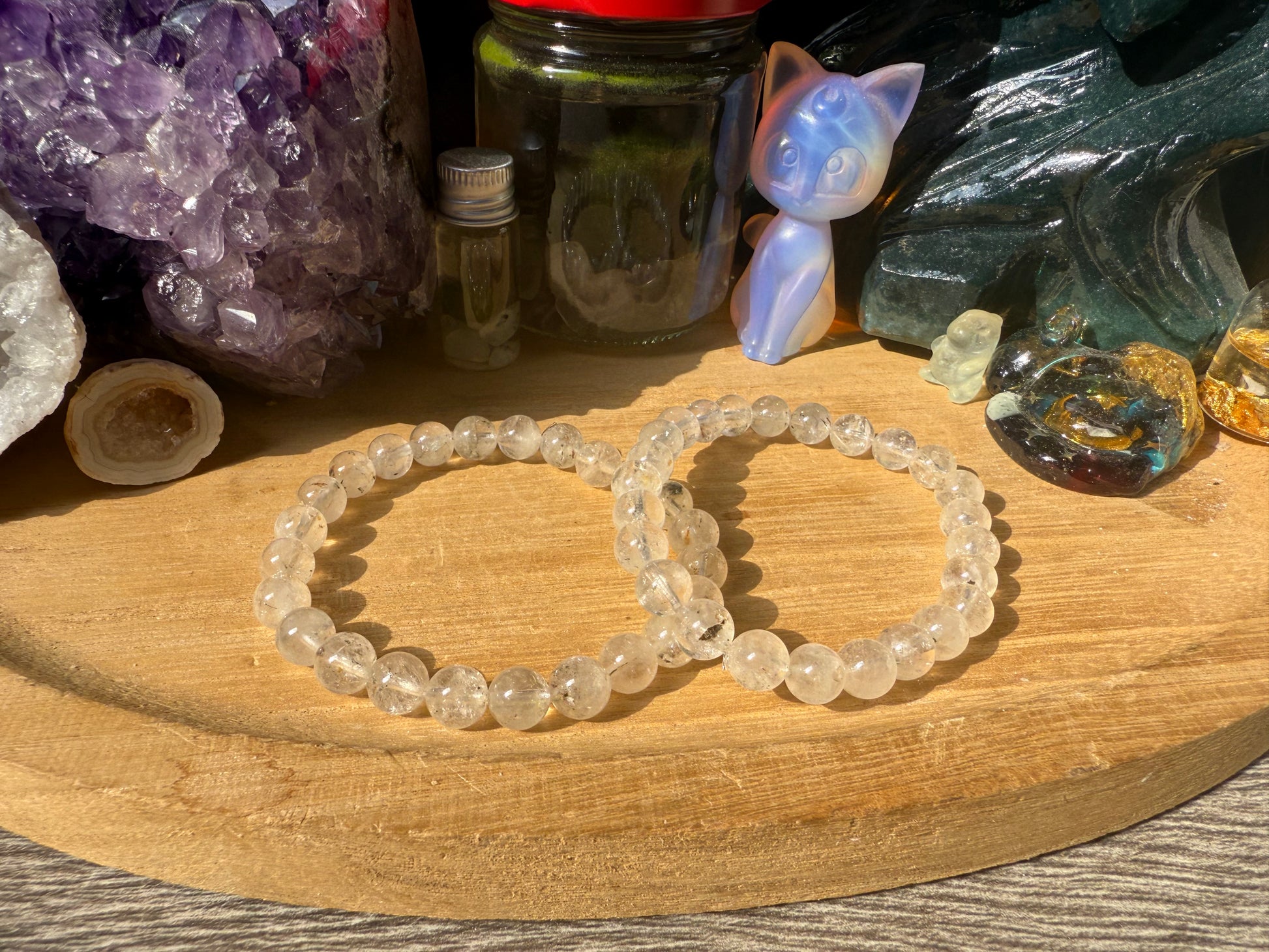 Ein wunderschönes Armband aus Petroleum Quarz auf Gummiband. Der Quarz enthält kleine Petroleum Einschlüsse die bei UV Licht sichtbar werden.