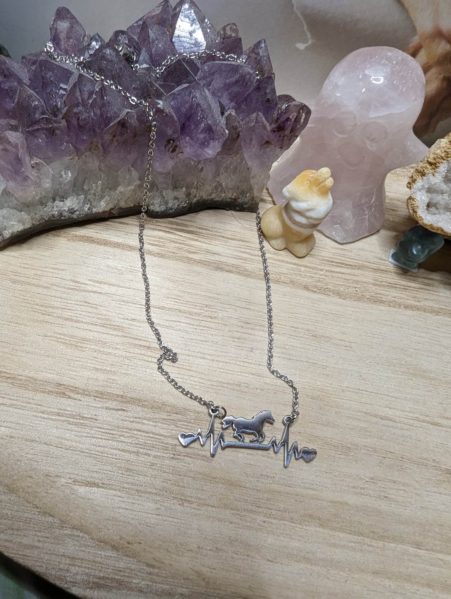Eine schöne Kette aus Edelstahl mit einem galoppierenden Pferd und dem Herzschlag.